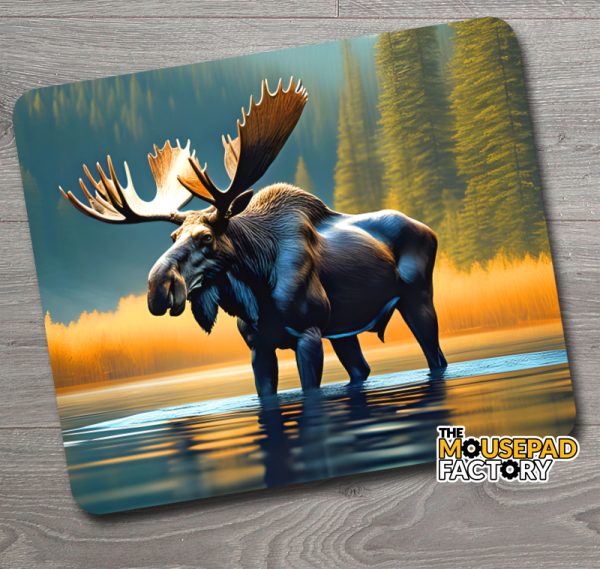 This Mouse Pad features a Bull Moose in a lake at sunrise.
