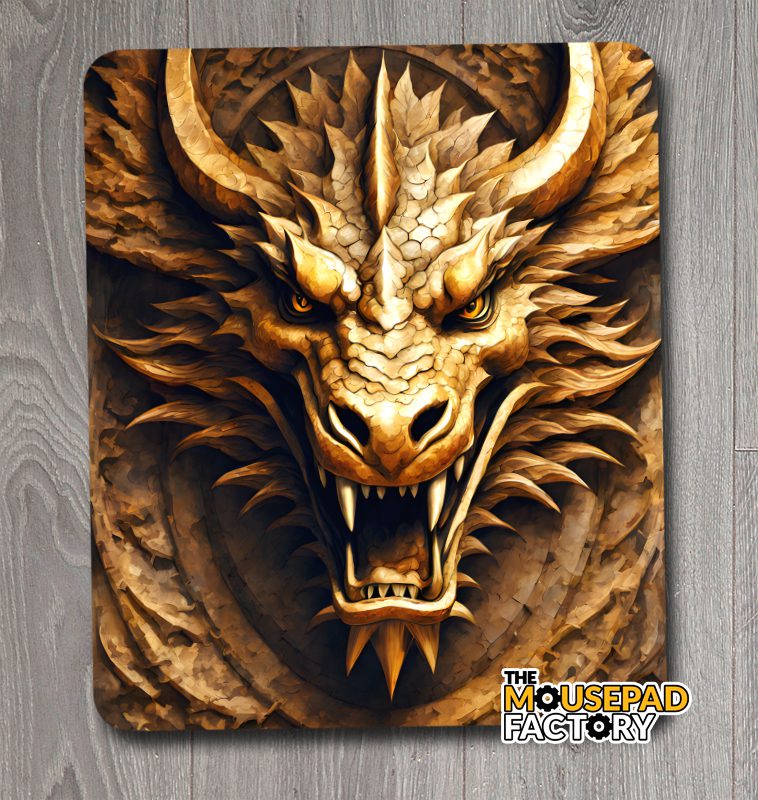 This Mouse Pad features a Fierce Golden Dragon.
