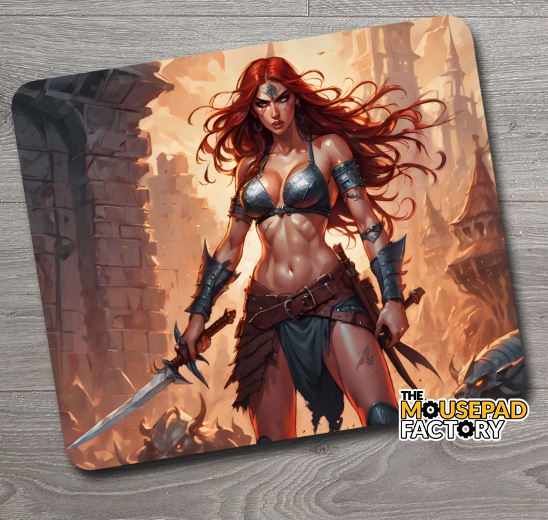 This Mouse Pad features a Sexy Red Warrior Barbarian Woman.