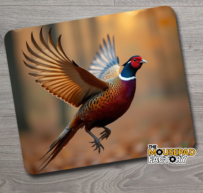 This Mouse Pad features a Ring-Necked Pheasant flying.