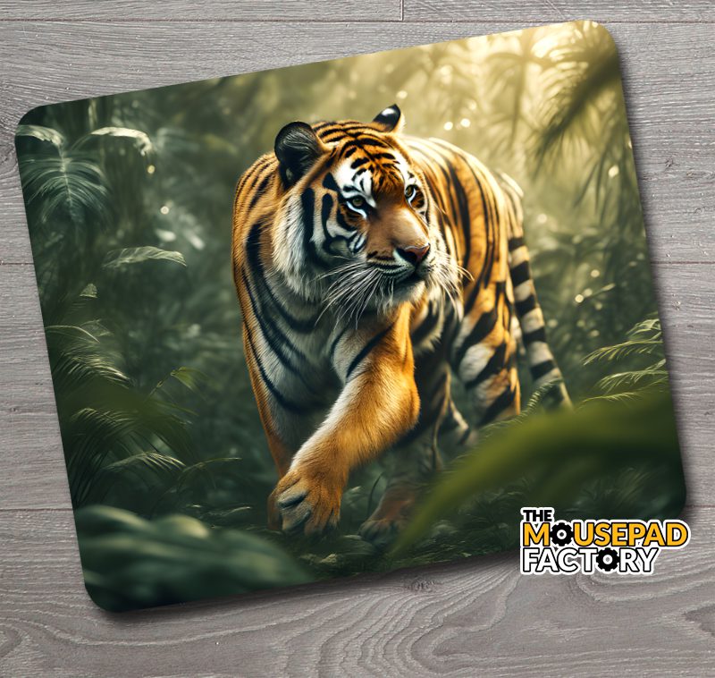 This Mouse Pad features a Tiger hunting in a dense forest.