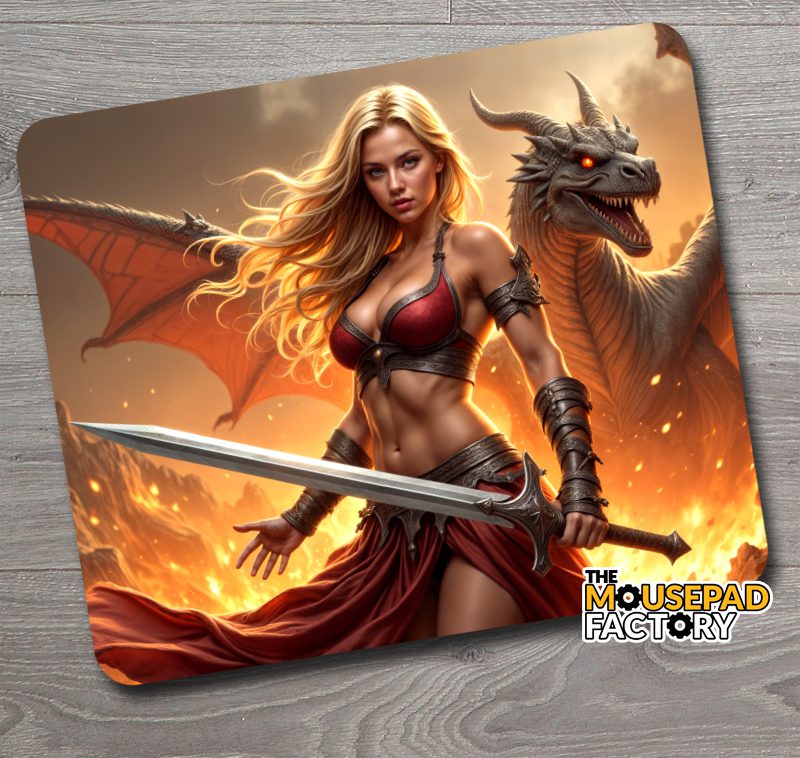This Mouse Pad features a Sexy Warrior Woman with a Fire Dragon.